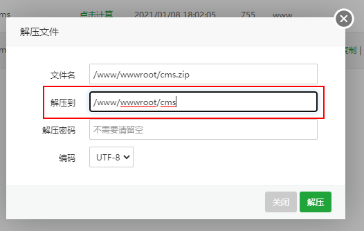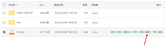 下载完成后,把cms.zip解压到网站目录/www/wwwroot/cms: