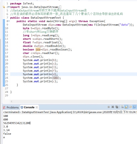 1 package IoTest; 2 import java.io.DataInputStream; 3 import java.io.FileInputStream; 4 import java.io.FileOutputStream; 5 //DataOutputStream写的文件只能用DataInputStream读 6 //并且读的顺序必须和写的顺序一致,而且是写了几个要读几个否则会导致读出的乱码 7 public class DataInputStreamTest { 8 public static void main(String[] args) throws Exception{ 9 DataInputStream dips=new DataInputStream(new FileInputStream("data")); 10 byte b=dips.readByte(); 11 short s=dips.readShort(); 12 long l=dips.readLong(); 13 float f=dips.readFloat(); 14 double d=dips.readDouble(); 15 boolean sex=dips.readBoolean(); 16 char c=dips.readChar(); 17 dips.close(); 18 //System.out.println(b); 19 System.out.println(s); 20 System.out.println(l); 21 System.out.println(f); 22 System.out.println(d); 23 System.out.println(sex); 24 System.out.println(c); 25 } 26 27 }