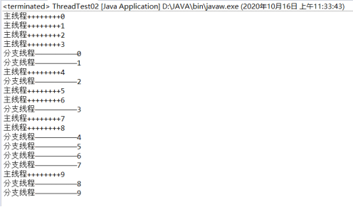 注:结果中出现主线程、分支线程交替输出,有多有少,有先有后,原因是:因为控制台只有一个,存在先执行后打印的情况。