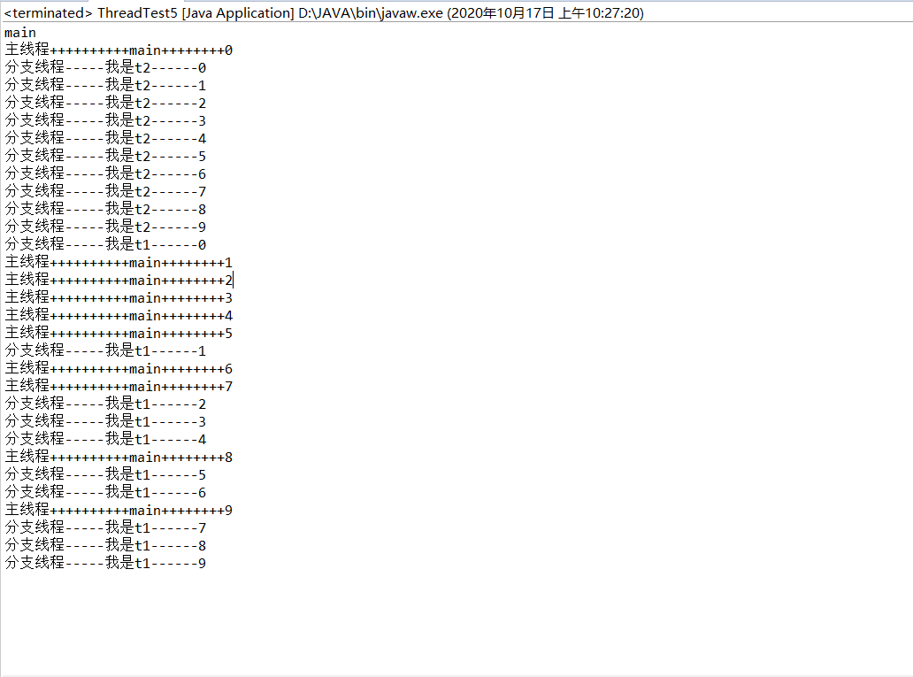 1 package XianChengFenXi; 2 /* 3 * 1.如何获取当前线程对象? 4 * 静态方法:static Thread currentThread(); 5 * Thread tt=Thread.currentThread();返回值tt就是当前线程 6 * 2.获取线程对象的名字 7 * 3.修改线程对象的名字 8 */ 9 10 public class ThreadTest5 { 11 12 public static void main(String[] args){ 13 14 //返回当前线程,这个tt就是当前线程对象 15 //这个代码出现在main()方法中,所以当前线程就是主线程 16 Thread tt=Thread.currentThread(); 17 System.out.println(tt.getName());//主线程的名字就叫main 18 19 20 MyThread2 t1=new MyThread2(); 21 MyThread2 t2=new MyThread2(); 22 23 //设置线程名字 24 t1.setName("我是t1"); 25 t2.setName("我是t2"); 26 27 //获取线程名字 28 t1.getName(); 29 30 //启动线程 31 t1.start(); 32 t2.start(); 33 for(int i=0;i<10;i++){ 34 System.out.println("主线程++++++++++"+tt.getName()+"++++++++"+i); 35 } 36 37 38 } 39 40 } 41 42 class MyThread2 extends Thread{ 43 public void run(){ 44 for(int i=0;i<10;i++){ 45 Thread tt=Thread.currentThread(); 46 System.out.println("分支线程-----"+tt.getName()+"------"+i); 47 } 48 } 49 }