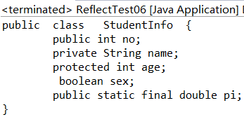 1 package Reflect; 2 import java.lang.reflect.Field; 3 import java.lang.reflect.Modifier; 4 5 //通过反射机制,反编译一个类的属性Field 6 public class ReflectTest06 { 7 public static void main(String[] args) throws Exception{ 8 StringBuilder s=new StringBuilder();//进行字符串拼接 9 Class studentClass=Class.forName("bean.StudentInfo");//StudentInfo类在包bean下 10 s.append(Modifier.toString(studentClass.getModifiers())+"\tclass\t"+studentClass.getSimpleName()+" {\n"); 11 /* 12 * 13 * .getModifiers()方法获取类名前面的修饰符(public、private、protected等),返回的是数字,可以通过Modifier.toString()方法转换成字符串 14 * .getSimpleName()方法获取类名 15 * 16 */ 17 Field[] fields=studentClass.getDeclaredFields(); 18 19 //遍历fields 20 21 for(Field field:fields){ 22 s.append("\t"); //缩进 23 s.append(Modifier.toString(field.getModifiers()));//获取属性的修饰名(Modifier):public、private、protected... 24 s.append(" ");//空格 25 s.append(field.getType().getSimpleName());//获取属性的类型名(Type):int、string、double... 26 s.append(" ");//空格 27 s.append(field.getName());//获取属性名:自己定义的名字如:no、name、age等 28 s.append(";\n"); 29 30 } 31 32 s.append("}"); 33 System.out.println(s); 34 35 } 36 37 }