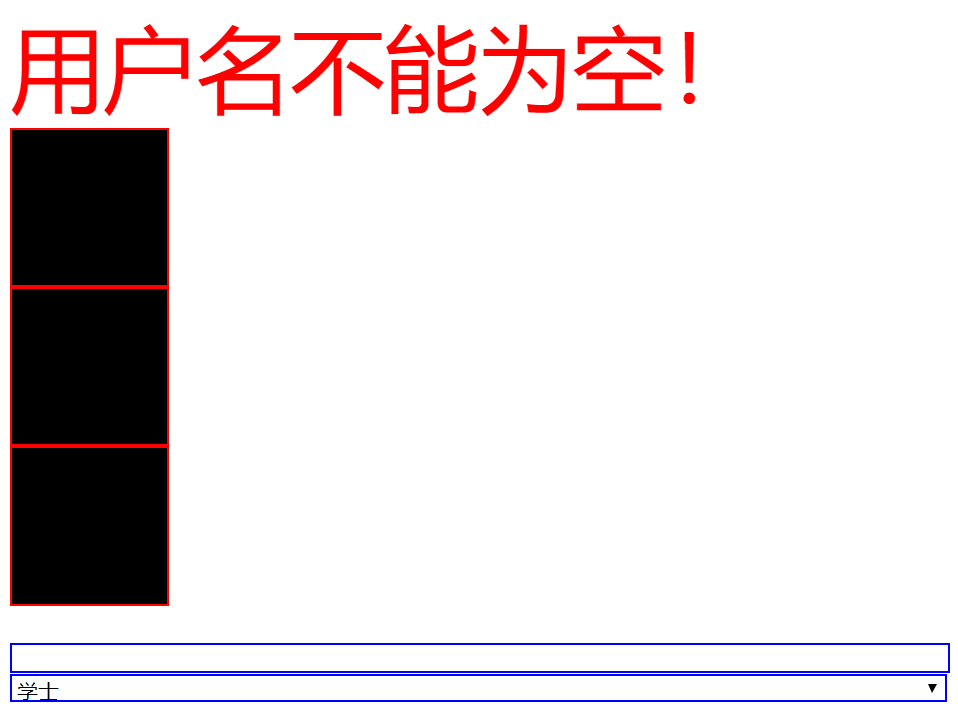 1 <!DOCTYPE html> 2 <html> 3 <head> 4 <meta charset="UTF-8"> 5 <title>CSS:样式块方式</title> 6 <style type="text/css"> 7 /* 8 * id选择器 9 * 语法格式: 10 * #id{ 11 * 样式名:样式值; 12 * 样式名:样式值; 13 * ...... 14 * } 15 */ 16 #usernameErrorMsg{ 17 color:red; 18 font-size: 60px; 19 } 20 21 22 /* 23 * 标签选择器 24 * 语法格式: 25 * 标签名{ 26 * 样式名:样式值; 27 * 样式名:样式值; 28 * ...... 29 * } 30 * 注:标签选择器的作用范围比id选择器的范围广,因为id是唯一的. 31 */ 32 div{ 33 background-color:black ; 34 border:1px solid red; 35 width: 100px; 36 height:100px; 37 } 38 39 40 41 /* 42 * 类选择器 43 * 语法格式: 44 * .类名{ 45 * 样式名:样式值; 46 * 样式名:样式值; 47 * ...... 48 * } 49 */ 50 51 .myclass{ 52 border:1px solid blue; 53 width: 600px; 54 } 55 56 </style> 57 </head> 58 <body> 59 <span id="usernameErrorMsg">用户名不能为空!</span> 60 61 <div></div> 62 <div></div> 63 <div></div><br /> 64 65 <input type="text" class="myclass"/><br /> 66 <select class="myclass"> 67 <option>学士</option> 68 <option>硕士</option> 69 <option>博士</option> 70 </select> 71 </body> 72 </html>
