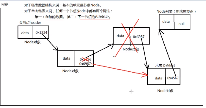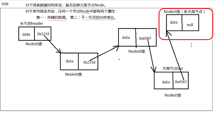(1)添加新元素(节点):新节点会添加到当前链表的末尾,当前末尾节点的下一节点地址由null改为新添加节点的地址,新添加的节点的下一节点地址为null,当继续添加新节点时,重复上述操作。