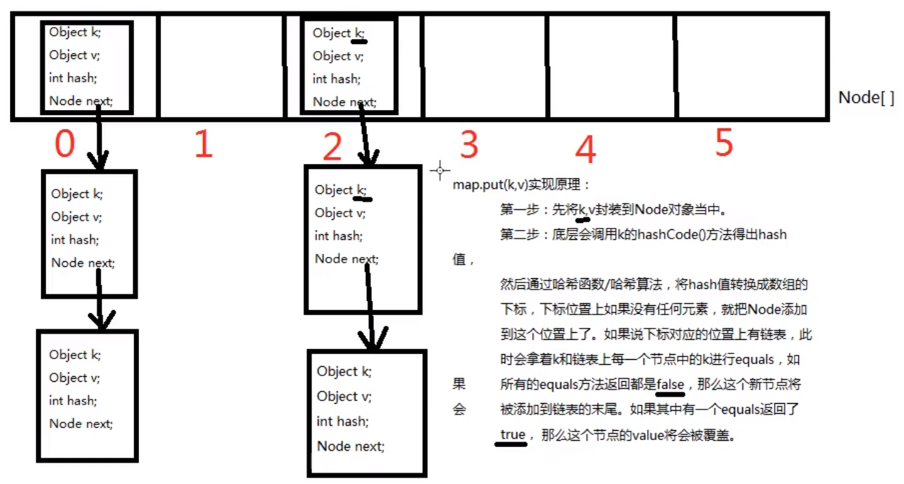 public class HashMap{ //HashMap底层实际上是一个数组(一维数组) Node<K,V> table; //静态内部类HashMap.Node static class Node<K,V>{ final int hash;//哈希值(哈希值是key的hashCode()方法的执行结果,hash值通过哈希算法可以转换成数组的下标) final K key; //存储到Map集合中的那个key V value; //存储到Map集合中的那个value Node<K,V>next; //下一个节点的内存地址 } } 哈希表(散列表):一维数组,这个数组中每一个元素是一个单向链表