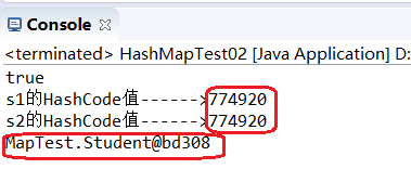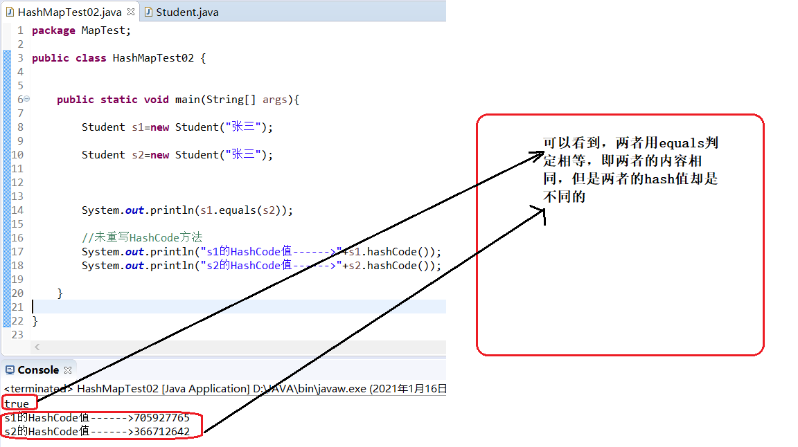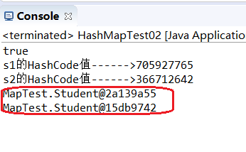 1 package MapTest; 2 3 import java.util.HashSet; 4 import java.util.Set; 5 6 public class HashMapTest02 { 7 8 9 public static void main(String[] args){ 10 11 Student s1=new Student("张三"); 12 13 Student s2=new Student("张三"); 14 15 16 17 System.out.println(s1.equals(s2)); 18 19 //未重写HashCode方法 20 System.out.println("s1的HashCode值------>"+s1.hashCode()); 21 System.out.println("s2的HashCode值------>"+s2.hashCode()); 22 23 //s1.equals(s2)结果是true,表示s1和s2是一样的,那么往HashSet里面放的话,按说只能放进去一个,因为HashSet集合的特点是:无序不可重复。 24 Set<Student>students=new HashSet<Student>(); 25 26 students.add(s1); 27 students.add(s2); 28 for(Student s:students){ 29 System.out.println(s); 30 } 31 } 32 33 }