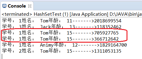 1 package ListSetMapTest; 2 3 import java.util.HashSet; 4 import java.util.Set; 5 6 public class HashSetTest { 7 8 public static void main(String[] args){ 9 Set<Student> s=new HashSet(); 10 s.add(new Student(1,"Tom",15)); 11 s.add(new Student(1,"Tom",15)); 12 s.add(new Student(1,"Animy",12)); 13 s.add(new Student(1,"Tom",11)); 14 s.add(new Student(2,"Tom",15)); 15 s.add(new Student(3,"Jack",13)); 16 17 for(Student st:s){ 18 System.out.println(st+"------->"+st.hashCode()); 19 } 20 21 } 22 23 } 24 25 class Student{ 26 int no; 27 String name; 28 int age; 29 30 public Student(int no, String name, int age) { 31 this.no = no; 32 this.name = name; 33 this.age = age; 34 } 35 36 @Override 37 public String toString() { 38 return "学号: " + no + "姓名: " + name + "年龄: " + age ; 39 } 40 41 42 43 44 }