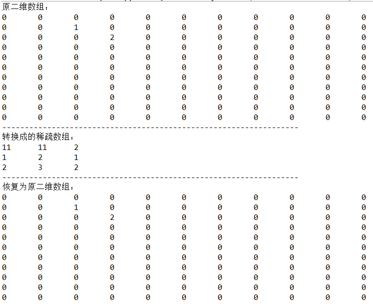 1 package Study; 2 3 public class XiShuShuZu { 4 5 public static void main(String[] args){ 6 int chessArr1[][]=new int[11][11]; 7 chessArr1[1][2]=1; 8 chessArr1[2][3]=2; 9 10 System.out.println("原二维数组:"); 11 for(int[] row:chessArr1){ 12 for(int data:row){ 13 System.out.printf("%d\t",data); 14 } 15 16 System.out.println(); 17 } 18 19 //System.out.println("行:"+chessArr1.length+" 列:"+chessArr1[0].length);//获取一个二维数组的行与列 20 21 22 23 //将二维数组转成稀疏数组 24 int sum=0; 25 for(int i=0;i<chessArr1.length;i++){ 26 for(int j=0;j<chessArr1[0].length;j++){ 27 if(chessArr1[i][j]!=0){ 28 sum++; 29 } 30 } 31 } 32 33 //创建稀疏数组 34 int sparseArr[][]=new int[sum+1][3]; 35 36 //赋值 37 38 //第一行 39 sparseArr[0][0]=chessArr1.length; //原二维数组的行数 40 sparseArr[0][1]=chessArr1[0].length;//原二维数组的列数 41 sparseArr[0][2]=sum;//原二维数组的元素个数 42 int k=0; 43 //遍历二维数组,将非0的值存放到稀疏数组中 44 for(int i=0;i<chessArr1.length;i++){ 45 for(int j=0;j<chessArr1[0].length;j++){ 46 if(chessArr1[i][j]!=0){ 47 k++; 48 sparseArr[k][0]=i; 49 sparseArr[k][1]=j; 50 sparseArr[k][2]=chessArr1[i][j]; 51 52 53 54 } 55 } 56 } 57 System.out.println("------------------------------------------------------------------"); 58 //打印 59 System.out.println("转换成的稀疏数组:"); 60 for(int[] row:sparseArr){ 61 for(int data:row){ 62 System.out.printf("%d\t", data); 63 } 64 System.out.println(); 65 } 66 67 68 //将稀疏数组恢复成原二维数组 69 int chessRow=sparseArr[0][0]; 70 int chessLine=sparseArr[0][1]; 71 int newChessArry[][]=new int[chessRow][chessLine]; 72 for(int i=1;i<sparseArr.length;i++){ 73 for(int j=0;j<sparseArr[0].length;j++){ 74 newChessArry[sparseArr[i][0]][sparseArr[i][1]]=sparseArr[i][2]; 75 } 76 } 77 System.out.println("------------------------------------------------------------------"); 78 79 //打印恢复后的数组 80 81 System.out.println("恢复为原二维数组:"); 82 for(int[] row: newChessArry){ 83 for(int data:row){ 84 System.out.printf("%d\t", data); 85 } 86 System.out.println(); 87 } 88 89 90 } 91 92 }