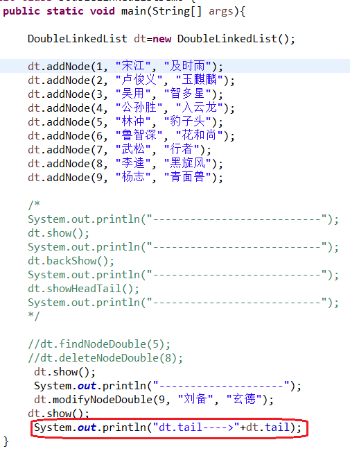 在main()方法,以及show()方法,还有modifyNodeDouble()方法中,对tail进行打印: