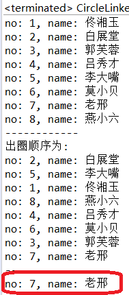 1 package LianBiao; 2 /* 3 * 循环链表 4 */ 5 public class CircleLinkedListDemo { 6 public static void main(String[] args){ 7 8 ChildNode c1=new ChildNode(1,"佟湘玉"); 9 ChildNode c2=new ChildNode(2,"白展堂"); 10 ChildNode c3=new ChildNode(3,"郭芙蓉"); 11 ChildNode c4=new ChildNode(4,"吕秀才"); 12 ChildNode c5=new ChildNode(5,"李大嘴"); 13 ChildNode c6=new ChildNode(6,"莫小贝"); 14 ChildNode c7=new ChildNode(7,"老邢"); 15 ChildNode c8=new ChildNode(8,"燕小六"); 16 17 18 CircleLinkedList cl=new CircleLinkedList(); 19 cl.addNode(c1); 20 cl.addNode(c2); 21 cl.addNode(c3); 22 cl.addNode(c4); 23 cl.addNode(c5); 24 cl.addNode(c6); 25 cl.addNode(c7); 26 cl.addNode(c8); 27 cl.showNode(); 28 System.out.println("------------"); 29 cl.showByNum(1, 10); 30 System.out.println("------------"); 31 cl.showNode(); 32 33 34 } 35 36 } 37 38 class ChildNode{ 39 int no; 40 String name; 41 ChildNode next; 42 43 @Override 44 public String toString() { 45 return "no: " + no + ", name: " + name ; 46 } 47 48 public ChildNode(int no, String name) { 49 super(); 50 this.no = no; 51 this.name = name; 52 53 } 54 55 56 57 } 58 59 class CircleLinkedList{ 60 ChildNode first=new ChildNode(-1,null); 61 int num=0;//记录圈中成员个数 62 63 64 //添加节点--成功实现 65 public void addNode(ChildNode child){ 66 if(first.next==null){ 67 first=child; 68 first.next=first; 69 num++; 70 }else{ 71 ChildNode temp=first; 72 while(true){ 73 if(temp.next==first){ 74 break; 75 }else{ 76 temp=temp.next; 77 } 78 } 79 temp.next=child; 80 child.next=first; 81 num++; 82 83 } 84 85 } 86 87 //遍历节点--成功实现 88 public void showNode(){ 89 if(first.next==null){ 90 System.out.println("链表为空!!!"); 91 }else{ 92 ChildNode temp=first; 93 while(true){ 94 if(temp.next==first){ 95 System.out.println(temp); 96 break; 97 }else{ 98 System.out.println(temp); 99 temp=temp.next; 100 } 101 } 102 } 103 } 104 105 //测试是否是环形链表--成功 106 public void showNodeTest(){ 107 ChildNode temp=first; 108 while(true){ 109 System.out.println(temp); 110 temp=temp.next; 111 } 112 } 113 114 //约瑟夫问题--成功实现(存在的问题:运行完此功能后,原有链表结构被破坏) 115 /* 116 * @param startNo:表示从第几个人出数 117 * @param countNum:表示数几下 118 * @param total:表示圈中成员总数 119 */ 120 public void showByNum(int startNo,int countNum){ 121 System.out.println("出圈顺序为:"); 122 int total=num; 123 ChildNode last;//last指针,用来指向first的上一个节点 124 if(first==null){ 125 System.out.println("链表为空,请添加数据!!!"); 126 }else{ 127 if(startNo<1||startNo>total){ 128 System.out.println("非法输入!!!"); 129 }else{ 130 131 //找到开始数的成员,将first指针移到此处,同时将last指针移到其后面 132 ChildNode temp=first; 133 while(true){ 134 if(temp.next.no==startNo){ 135 last=temp; 136 first=temp.next; 137 break; 138 }else{ 139 temp=temp.next; 140 } 141 } 142 143 //开始循环 144 while(true){ 145 if(first.next==first){ 146 System.out.println(first); 147 break; 148 }else{ 149 for(int i=1;i<countNum;i++){ 150 first=first.next; 151 last=last.next; 152 } 153 System.out.println(first); 154 first=first.next; 155 last.next=first; 156 } 157 } 158 159 160 } 161 } 162 163 } 164 }