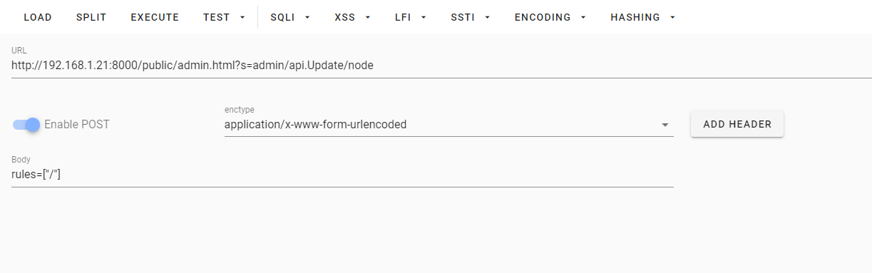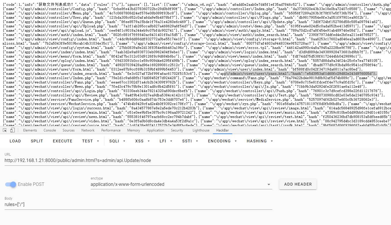 然后我们使用hackbarpost一段数据过去,rules=["/"],rules字段值即为你要遍历的目录,但是这个漏洞个人感觉十分的鸡肋,它的遍历范围是有限的并且返回的内容也很乱