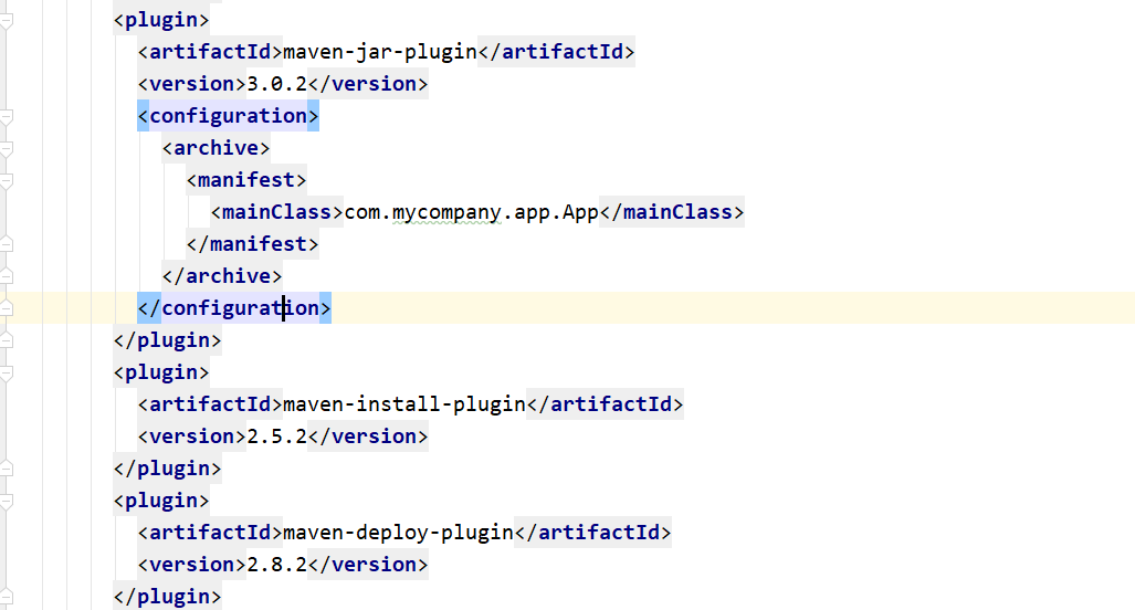 maven-jar-plugin,在<version>3.0.2</version>下面加上:<configuration> <archive> <manifest> <mainClass>com.mycompany.app.App</mainClass> </manifest> </archive> </configuration>其实这段话的意思就是指定com.mycompany.app.App作为运行的主类。