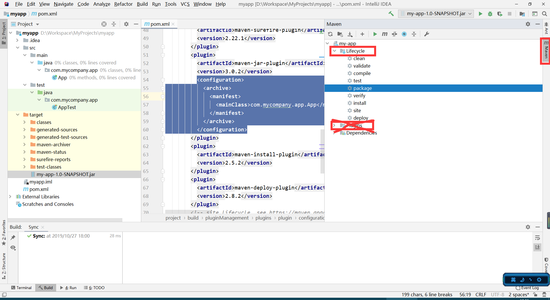 点击右侧的Maven,然后打开“my-app”,打开Lifecycle,双击package(相当于命令行的mvn package),这样项目就会生成target目录了
