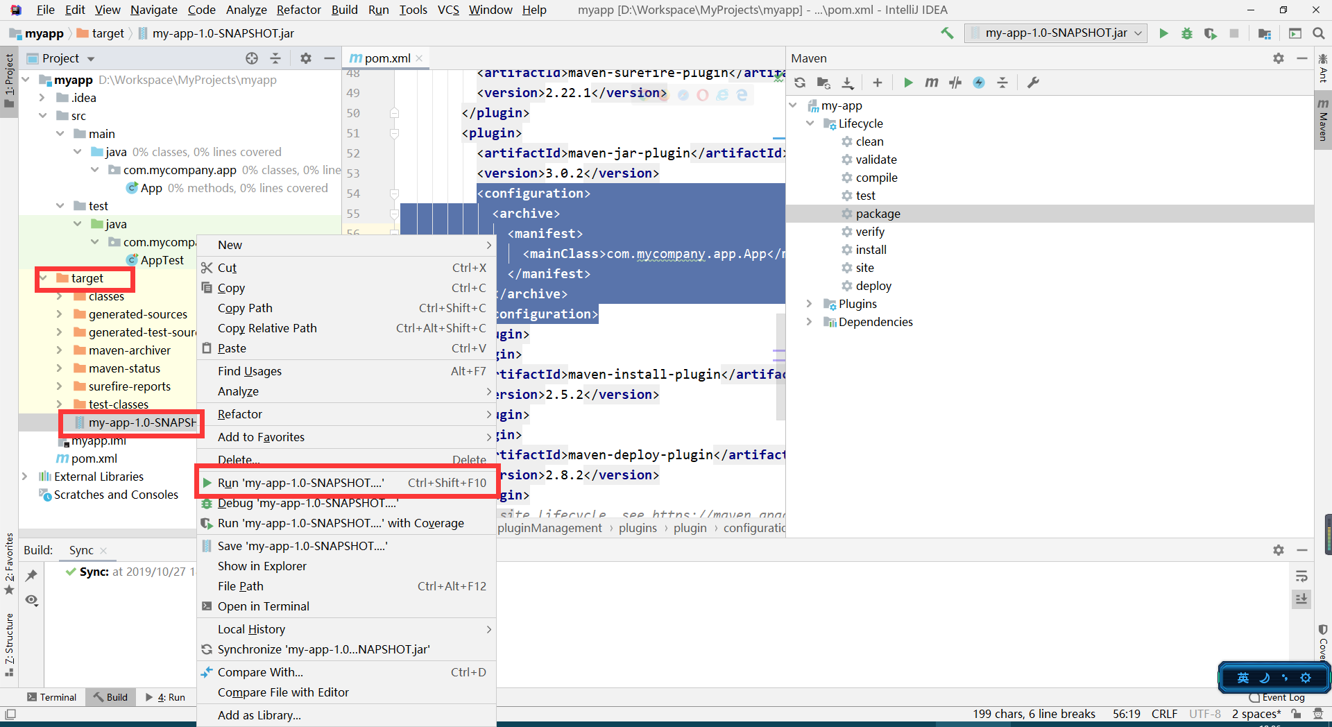 打开target目录,右键my-app-1.0-SNAPSHOT.jar,选择‘Run my-app-1.0-SNAPSHOT...’或者直接同时按下 Ctrl + Shift+ F10,这样就运行了,输出“Hello World!”
