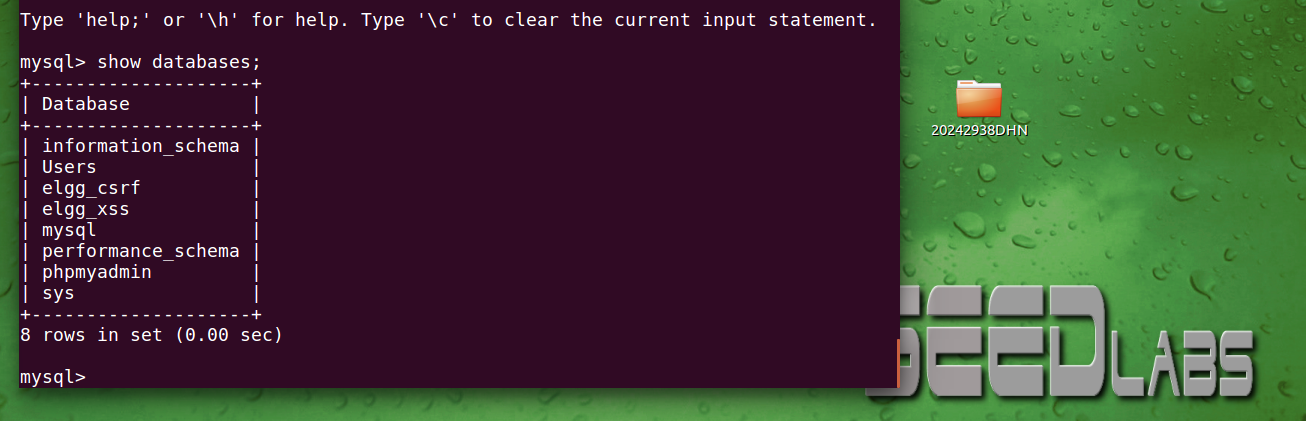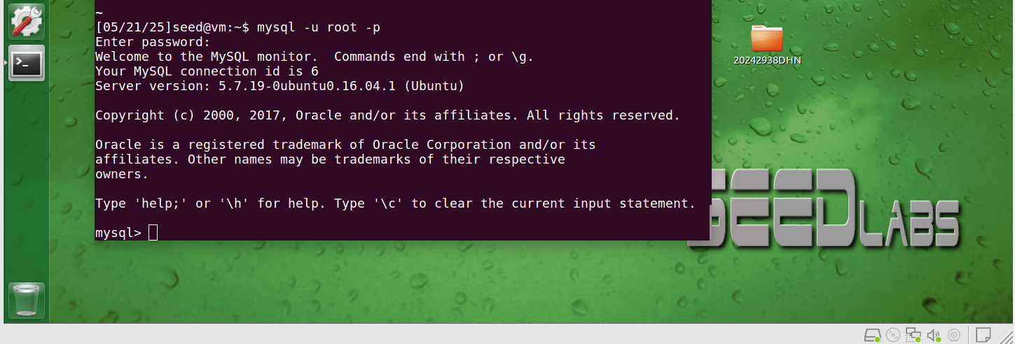 输入命令mysql -u root -p登录mysql数据库,密码seedubuntu