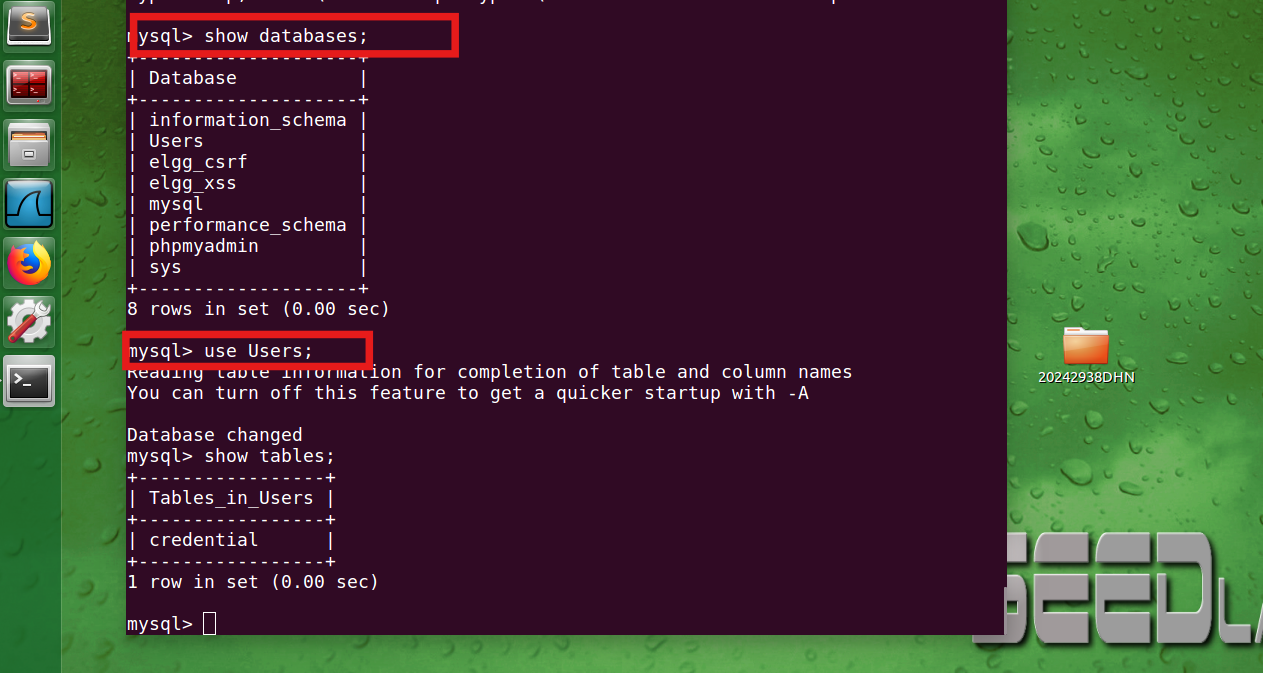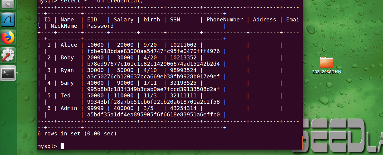 熟悉SQL语句: 我们已经创建了一个名为Users的数据库,其中包含一个名为creditential的表。该表存储了每个员工的个人信息(例如,eid,密码,薪水,ssn等)。在此任务中,您需要使用数据库来熟悉SQL查询。