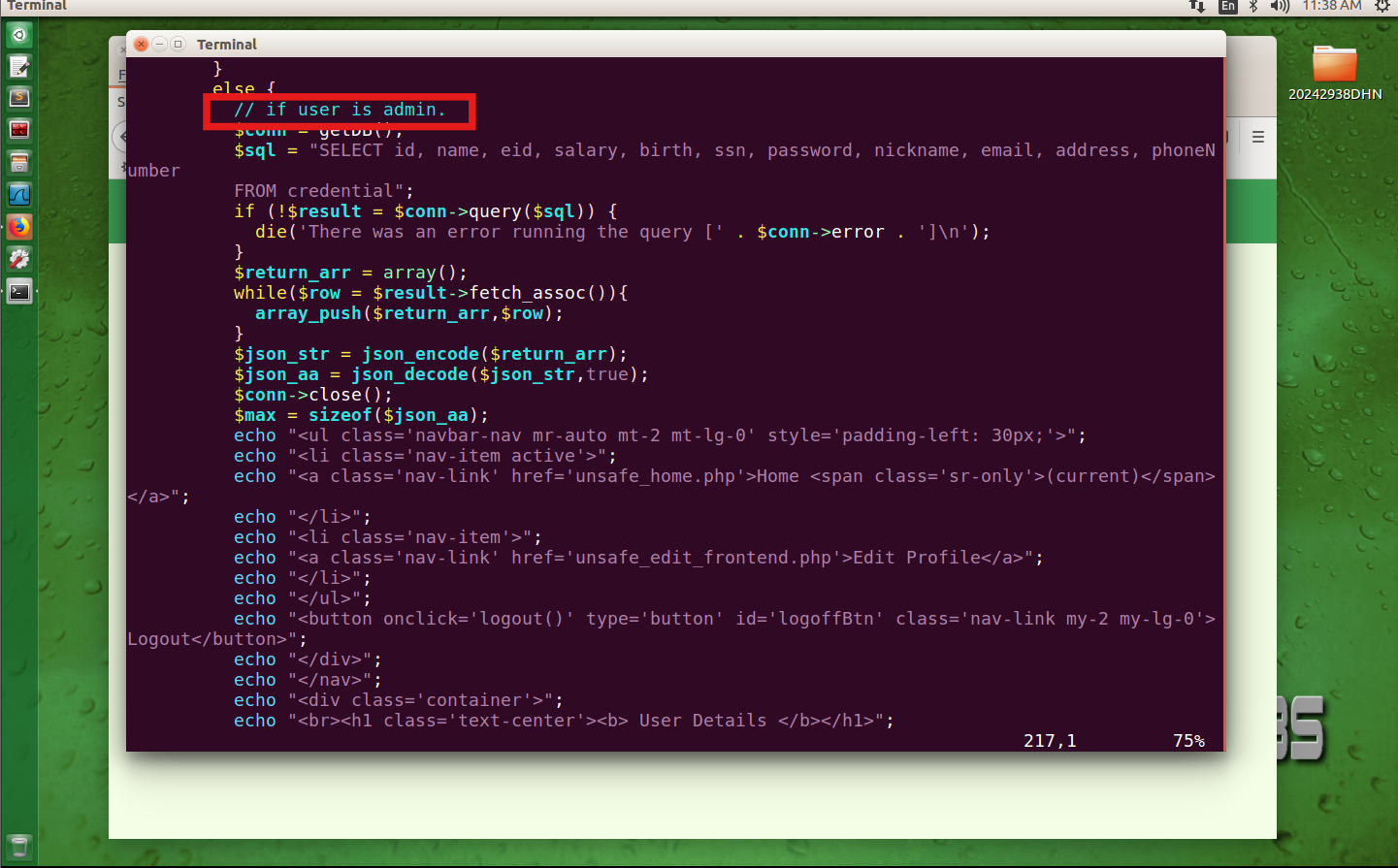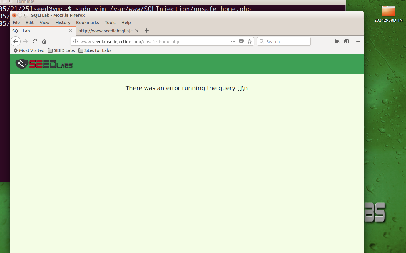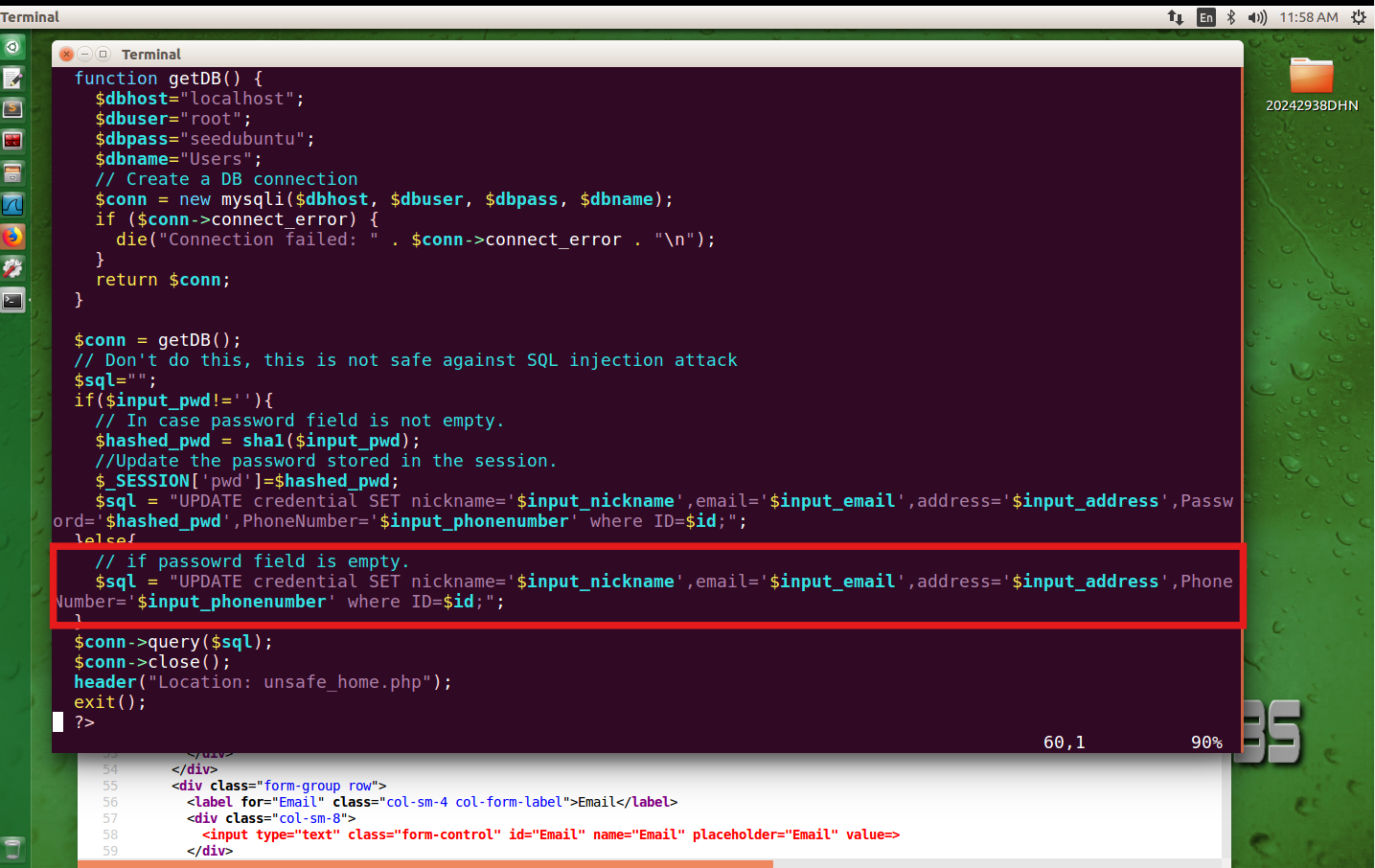 在终端中输入sudo vim /var/www/SQLInjection/unsafe_home.php