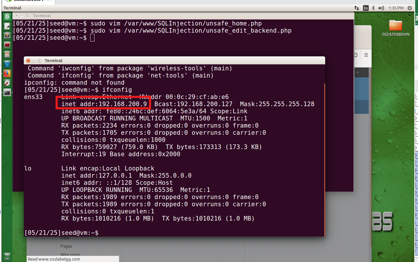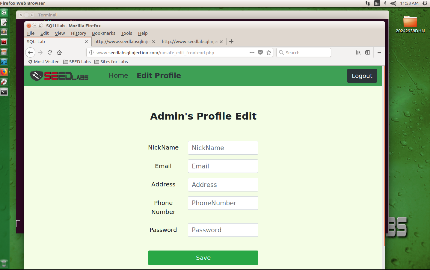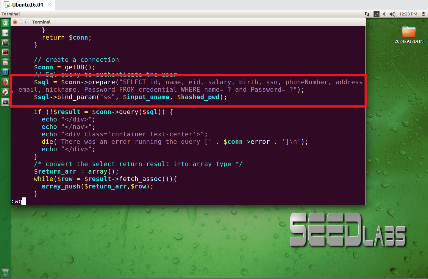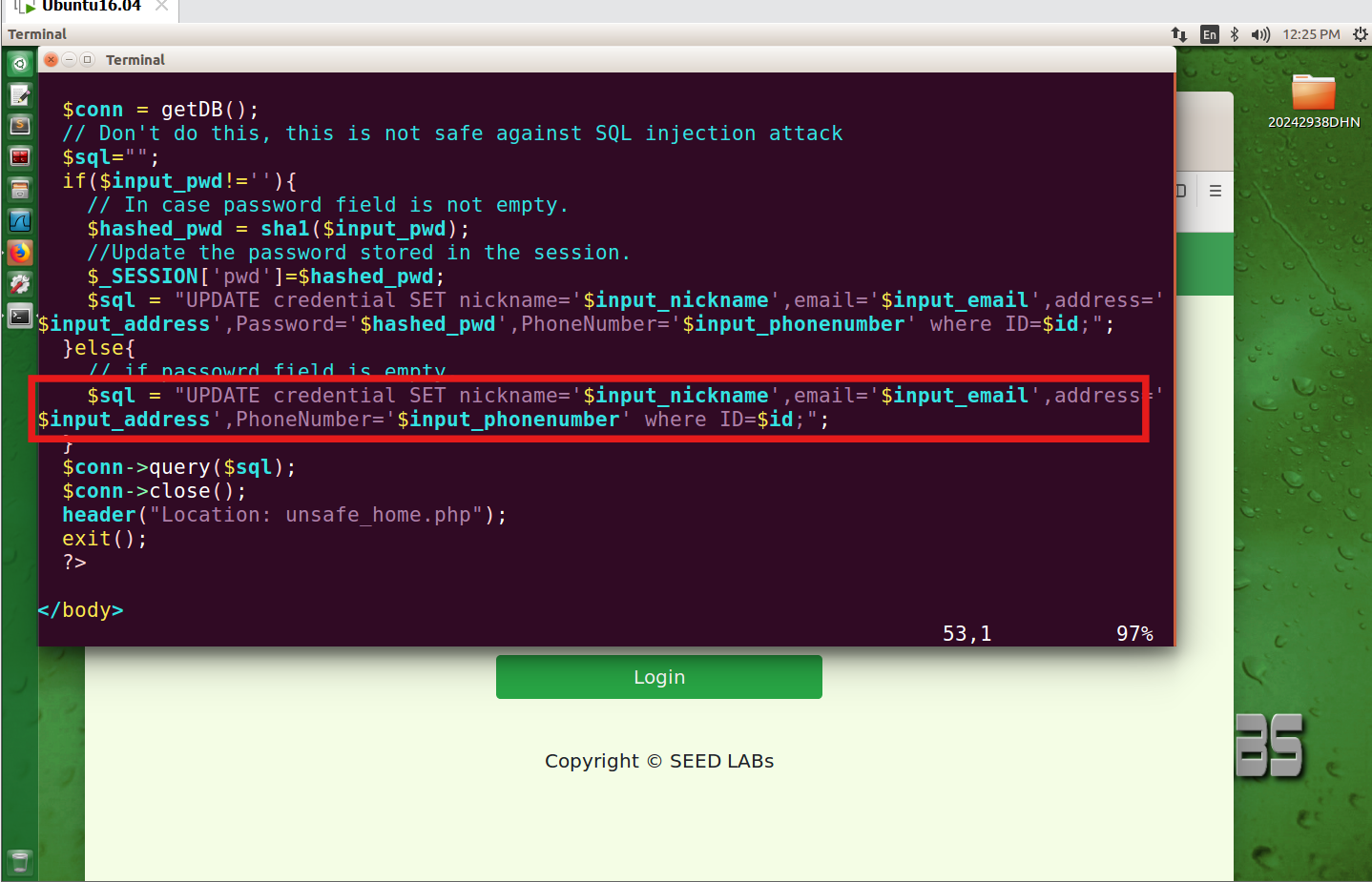 在终端中输入sudo vim /var/www/SQLInjection/unsafe_edit_backend.php对该文件进行编辑