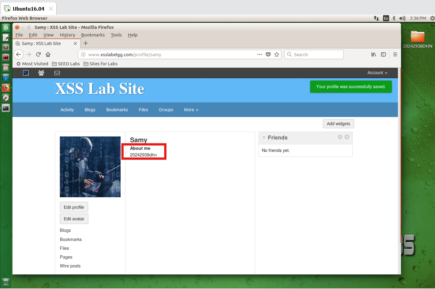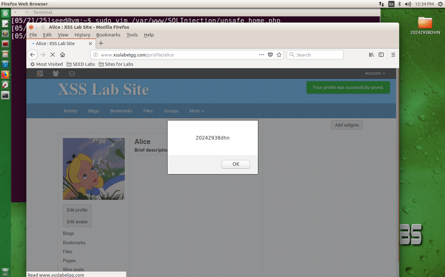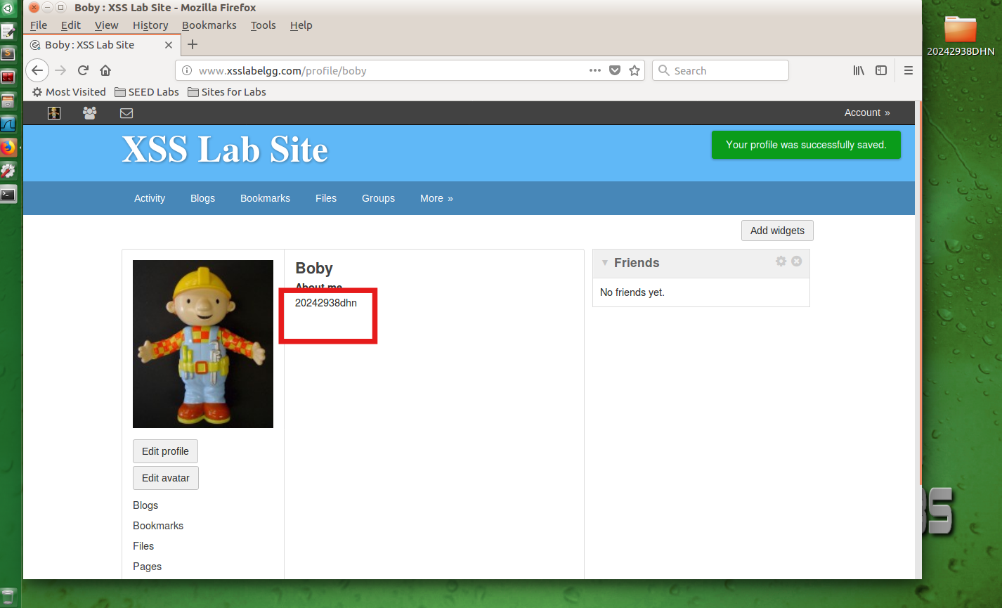 点击Edit profile在下面Brief description文本框输入<script>alert('20242938dhn');</script> 语句之后,点击"Save"按钮保存,出现弹窗