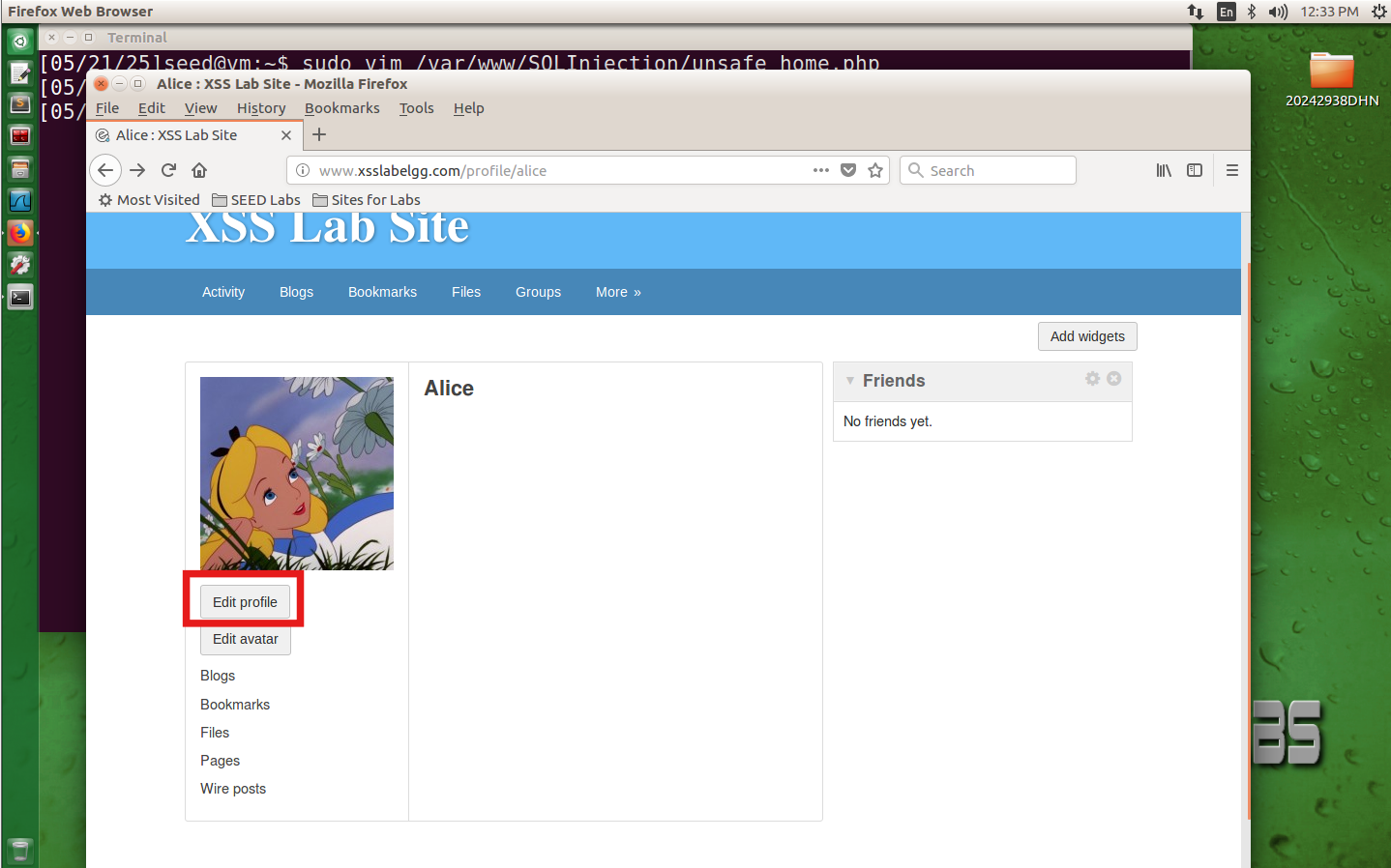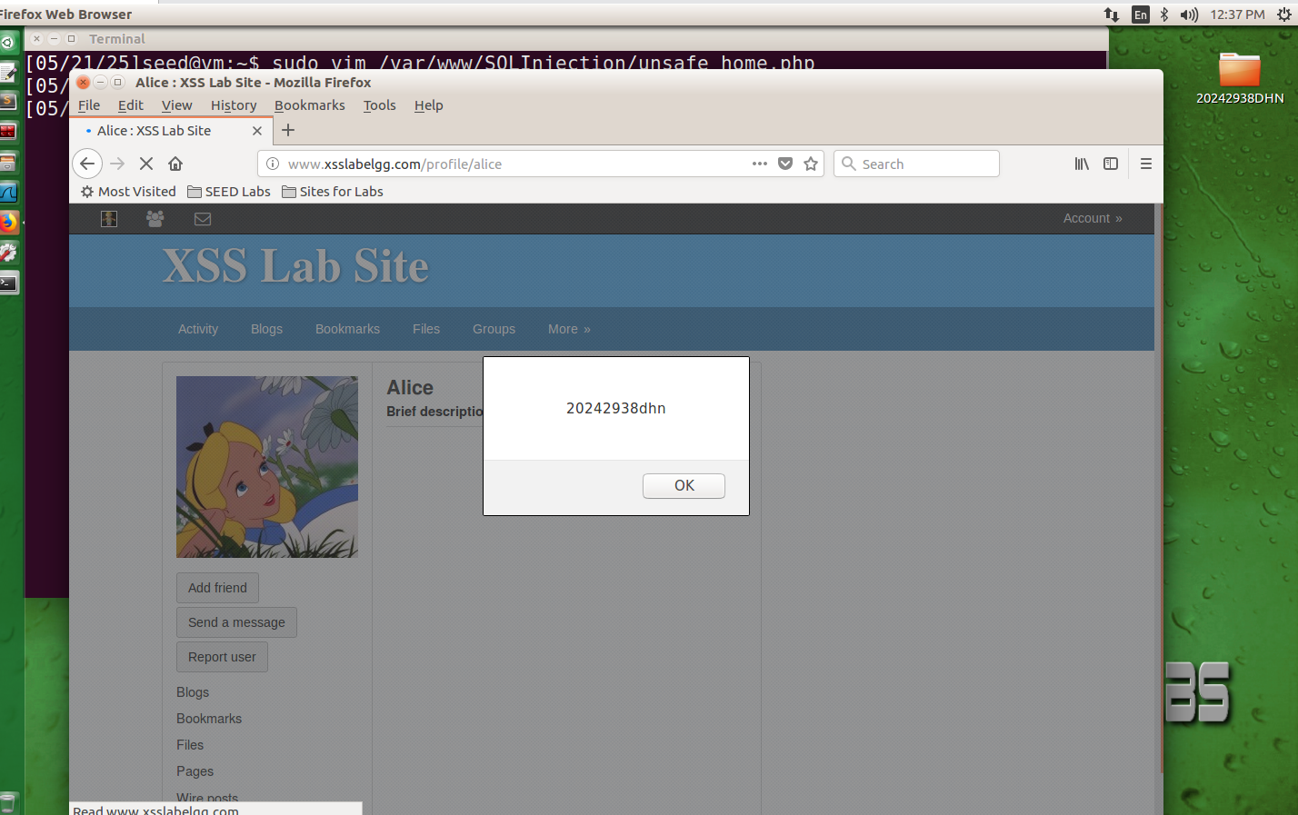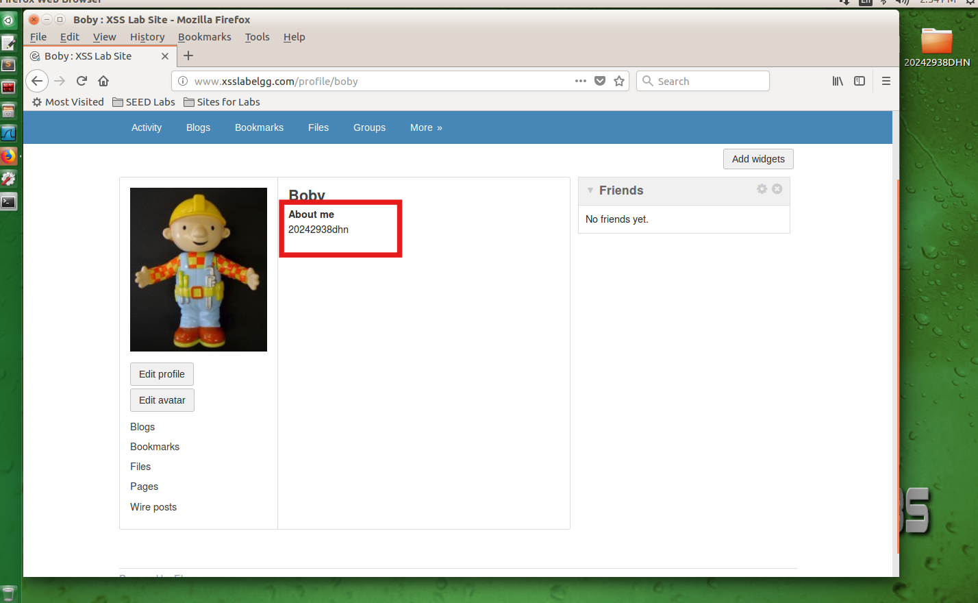 点击Edit profile在下面Brief description文本框输入<script>alert('20242938dhn');</script> 语句之后,点击"Save"按钮保存,出现弹窗