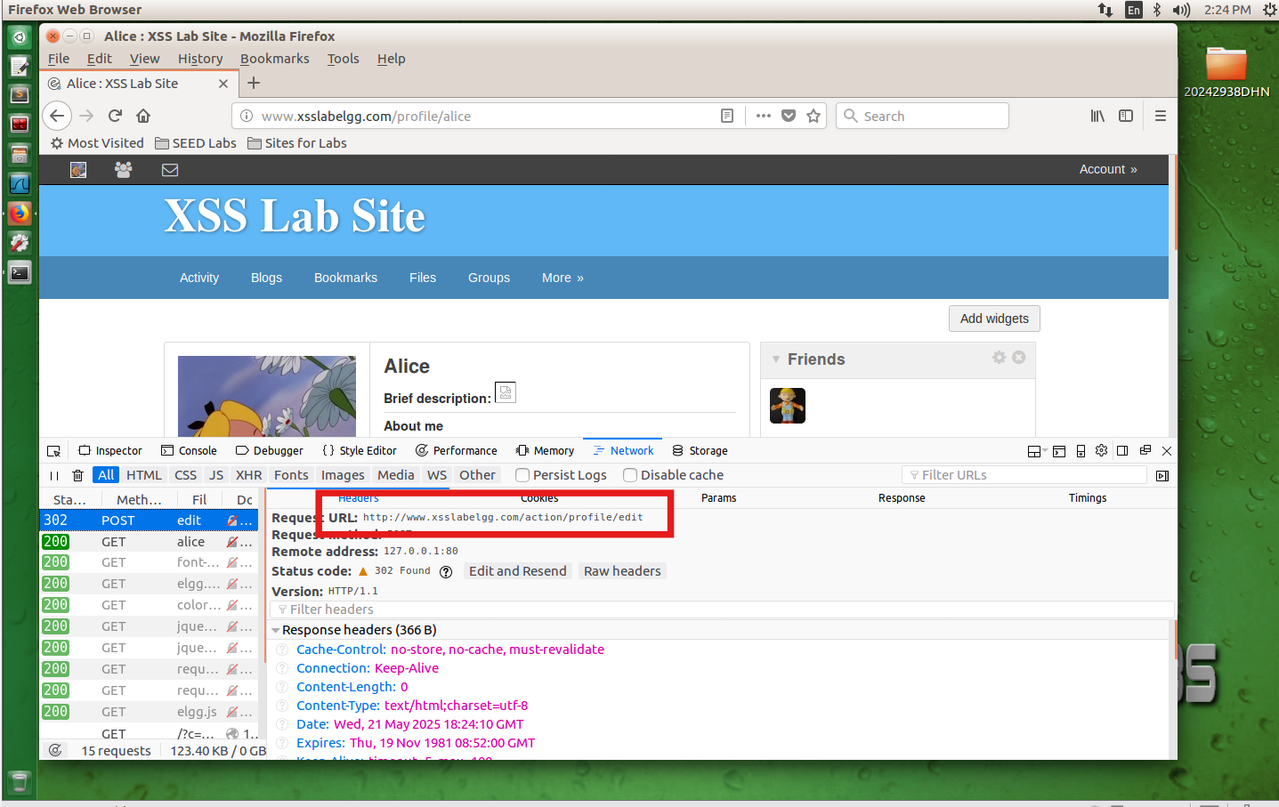 登录Alice账号,修改About me中的内容,按F12打开开发者模式的network中可以看到用 POST 的方式提交表单给 http://www.xsslabelgg.com/action/profile/edit