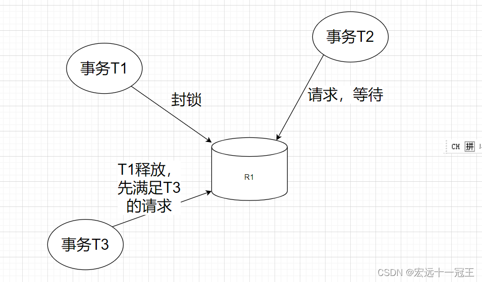 活锁就是一个事务在等待其他锁的释放,但是这个锁释放后先满足了其他事务的请求,事务T2就永远在等待。