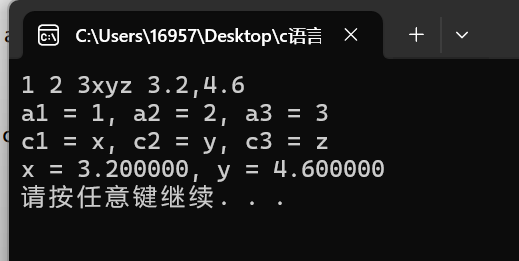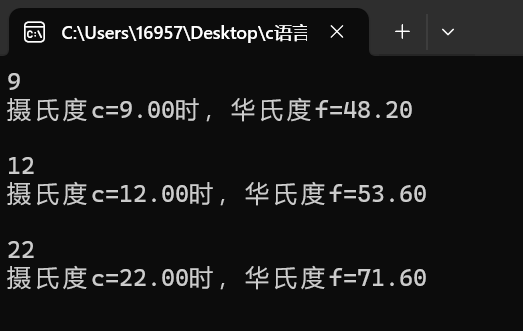 printf("摄氏度c=%.2f时,华氏度f=%.2f\n",c,f);