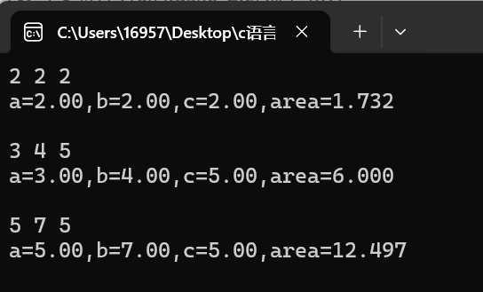 printf("a=%.2f,b=%.2f,c=%.2f,area=%.3f\n",a,b,c,area);
