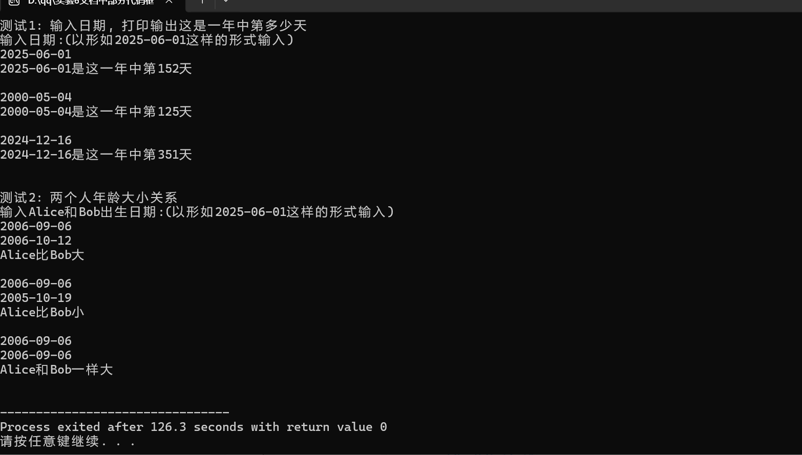 printf("输入Alice和Bob出生日期:(以形如2025-06-01这样的形式输入)\n");