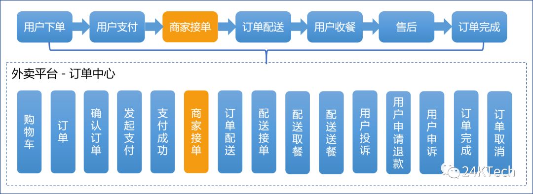 以普通用户的视角来看,一个外卖订单从下单后,会经历支付、商家接单、配送、用户收货、售后及订单完成多个阶段。