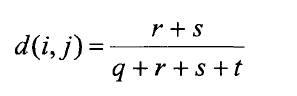 (2)非对称的二元相异度(两个都取值为的称为负匹配,而两个都取值为的情况称为正匹配。因为对于非对称的二元变量,正匹配较之负匹配的取值更加的有意义,因此,这样的二元变量经常被认为“一元的”,即只有一个状态。)相异度为