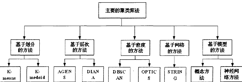 主要包括:基于划分的聚类算法,基于层次的聚类算法,基于密度的聚类算法、基于网格的聚类算法和基于模型的聚类算法。