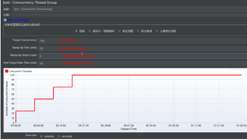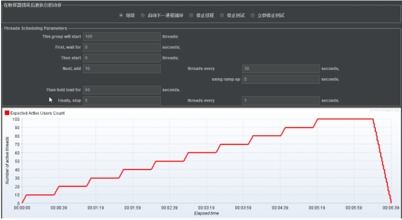 下图:我用30s的时间内,有4次灵活调整并发用户数的机会,来测试服务器,看服务器能否支持100并发用户数的目标。