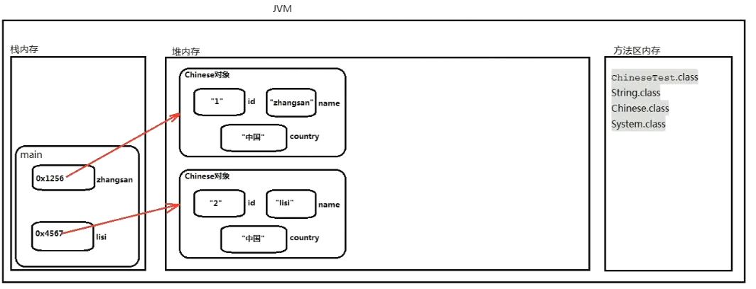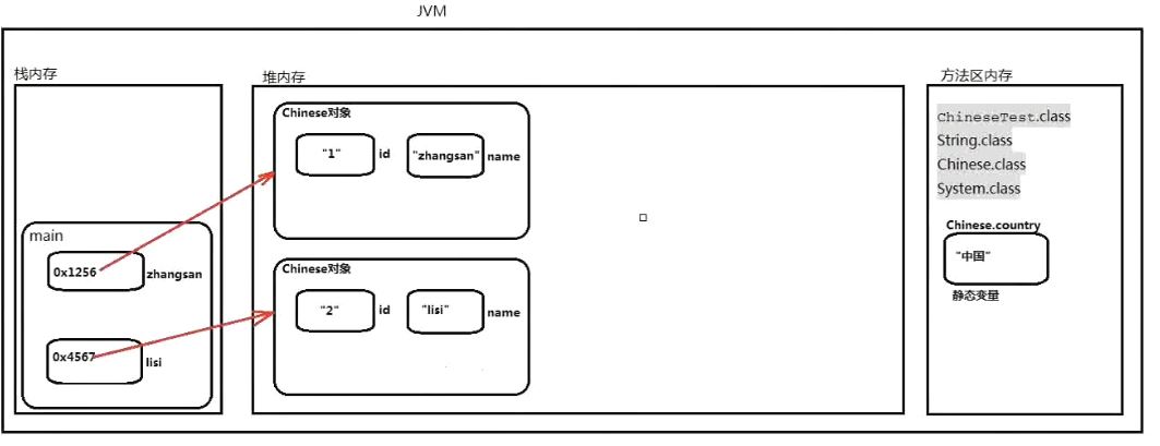 package StaticTest09.javase; public class ChineseTest { public static void main(String[] args) { //创建中国人对象1 Chinese zhangsan = new Chinese("1","张三","中国"); System.out.println(zhangsan.id + "," + zhangsan.name + "," + zhangsan.country); //创建中国人对象2 Chinese lisi = new Chinese("2","李四","中国"); System.out.println(lisi.id + "," + lisi.name + "," + lisi.country); } }