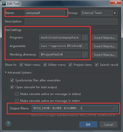 Name:autopep8 (可随意填写) Tools settings: Programs:安装目录\Scripts\autopep8.exe (program一栏对应的是工具位置,通过pip安装后其在python安装目录的子目录Scripts中。我们在Scripts目录下能找到autopep8.exe文件) Arguments:--in-place --aggressive $FilePath$ Working directory:$ProjectFileDir$ Advanced Options: Output filters:$FILE_PATH$\:$LINE$\:$COLUMN$\:.*