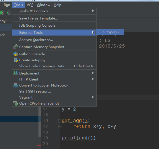 第二种,在菜单栏选择【Tools】-->【External Tools】-->【autopep8】