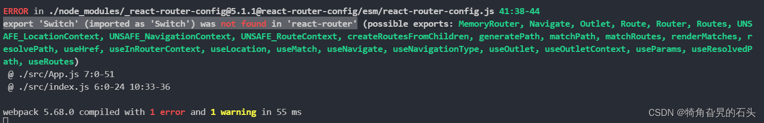 我只好顺着错误去看看react-router-config的源码,这里发现react-router-config使用的竟然还是react-router v5的Switch,我当时就无语了,哥们时代变了你不知道吗,我的react-router-dom是^6,所以才产生了报错。