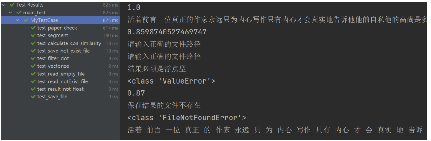 由图可知,10个测试通过,一共耗时825ms,文章查重测试耗时为614ms,分词耗时180ms