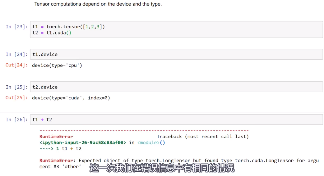 import torch import numpy as np t3=torch.tensor([1,2,3]) t4=t3.cuda() print(t3.device,t4.device) print(t3+t4) 结果为: cpu cuda:0 Traceback (most recent call last): File "E:/code/python/DLT/data/deeplizard.py", line 7, in <module> print(t3+t4) RuntimeError: Expected all tensors to be on the same device, but found at least two devices, cuda:0 and cpu!