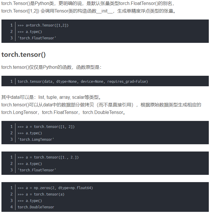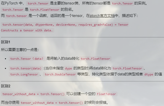 torch.Tensor()是python类,更明确地说,是默认张量类型torch.FloatTensor()的别名,torch.Tensor([1,2])会调用Tensor类的构造函数init,生成单精度浮点类型的张量。