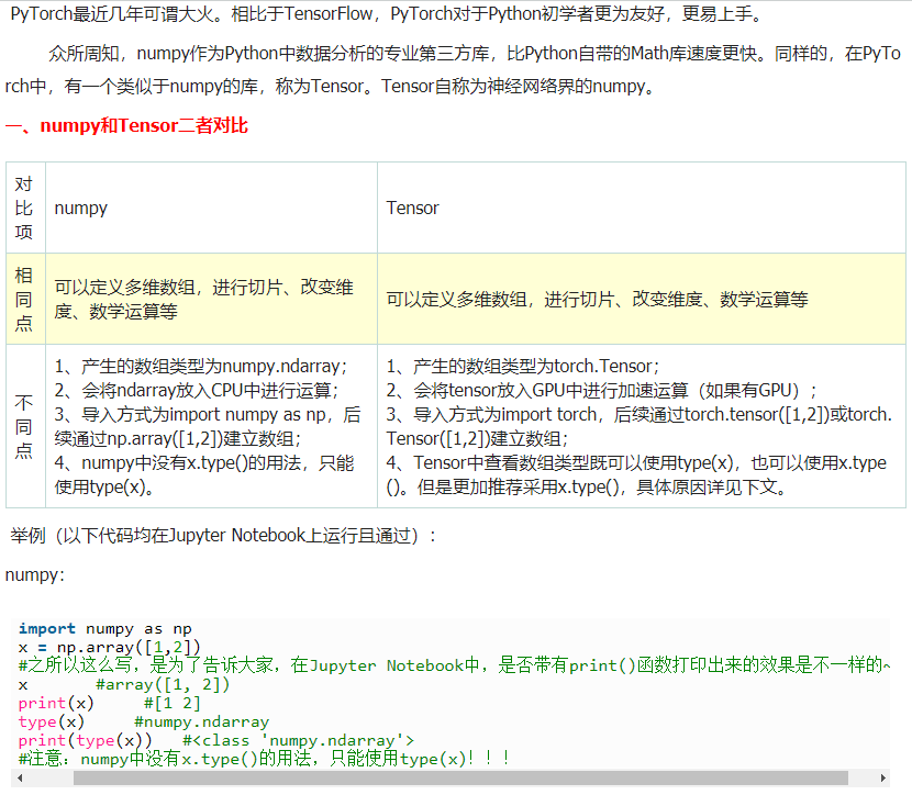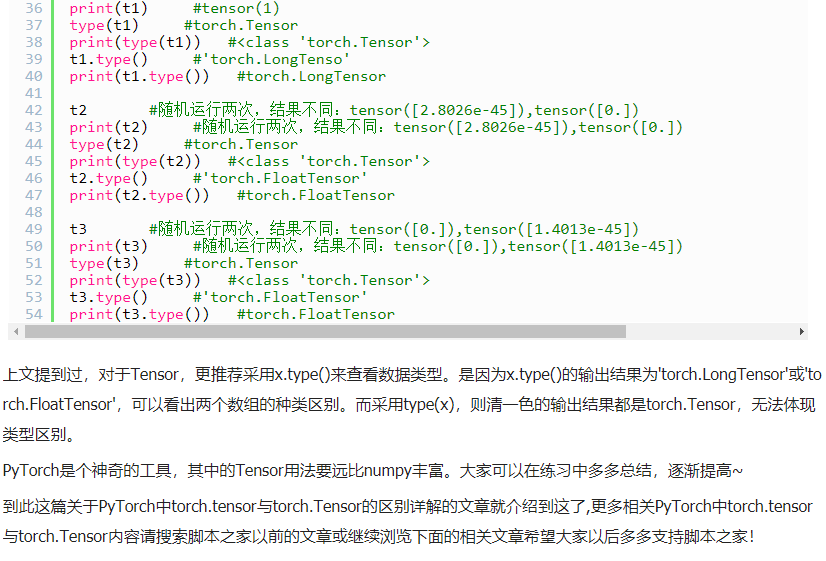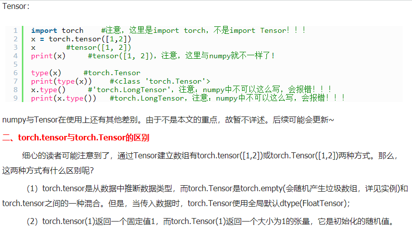 import torch import numpy as np data=np.array([1,2,3]) t5=torch.tensor(data) t6=torch.Tensor(data) t7=torch.as_tensor(data) t8=torch.from_numpy(data) print("data: ",data,'data type: ',type(data)) print('t5: ',t5,'t5 type: ',type(t5)) print('t6: ',t6,'t6 type: ',type(t6)) print('t7: ',t7,'t7 type: ',type(t7)) print('t8: ',t8,'t8 type: ',type(t8)) 结果如下: data: [1 2 3] data type: <class 'numpy.ndarray'> t5: tensor([1, 2, 3], dtype=torch.int32) t5 type: <class 'torch.Tensor'> t6: tensor([1., 2., 3.]) t6 type: <class 'torch.Tensor'> t7: tensor([1, 2, 3], dtype=torch.int32) t7 type: <class 'torch.Tensor'> t8: tensor([1, 2, 3], dtype=torch.int32) t8 type: <class 'torch.Tensor'>