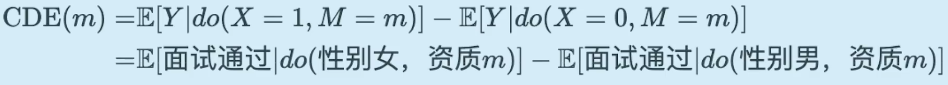 那么作为一个简化的模型,我们可以把申请人的资质作为一个中间变量进行分析,在做中介分析的时候,经常会去看的一个指标叫做controlled direct effect (CDE),在此问题中,CDE就是说在性别是女,资质是某个m的情况下,面试是否通过的概率,减去性别是男资质是m的某种情况下通过的概率。这里要把资质和性别都完全控制起来。这样就可以知道在资质完全相同的情况下男生和女生的通过率。