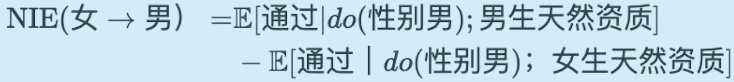 NIE就是假设我们不变输入的变量X,而是改变中间变量m,来看看结果有什么不同。那么这次就是让女生全部伪装成男生去面试,但是男生还是正常的去面试。那这个时候计算的结果就是nie,资质是不一样的,但是性别都是男性,