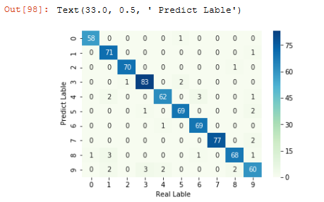 1 # 导入第三方模块 2 from sklearn import metrics 3 # 混淆矩阵 4 cm = metrics.confusion_matrix(y_test, pred) 5 6 import seaborn as sns 7 import matplotlib.pyplot as plt 8 sns.heatmap(cm,annot = True,cmap = 'GnBu') 9 plt.xlabel(' Real Lable') 10 plt.ylabel(' Predict Lable')