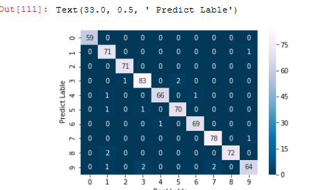 1 from sklearn import metrics 2 cm = metrics.confusion_matrix(y_test,pred_svc) 3 4 import seaborn as sns 5 import matplotlib.pyplot as plt 6 sns.heatmap(cm,annot=True,cmap='PuBu_r') 7 plt.xlabel(' Real Lable') 8 plt.ylabel(' Predict Lable')