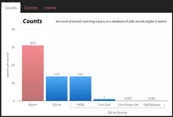 每秒能在20万条数据中进行查询后count的次数。realm每秒可以进行30.9次查询后count。