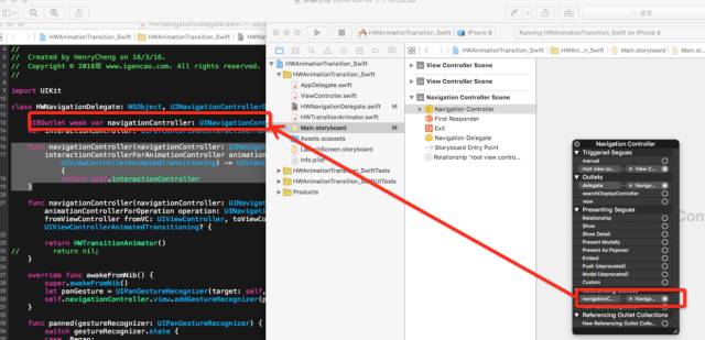 添加手势实现动画效果,我们在刚才的HWNavigationDelegate类里实现UINavigationControllerDelegate的另外一个斜一方法