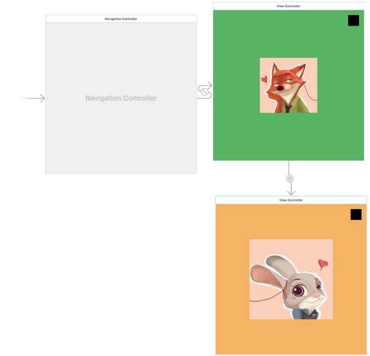 最后,分别在两个VC的中间添加一个imageView,最后的效果图如下